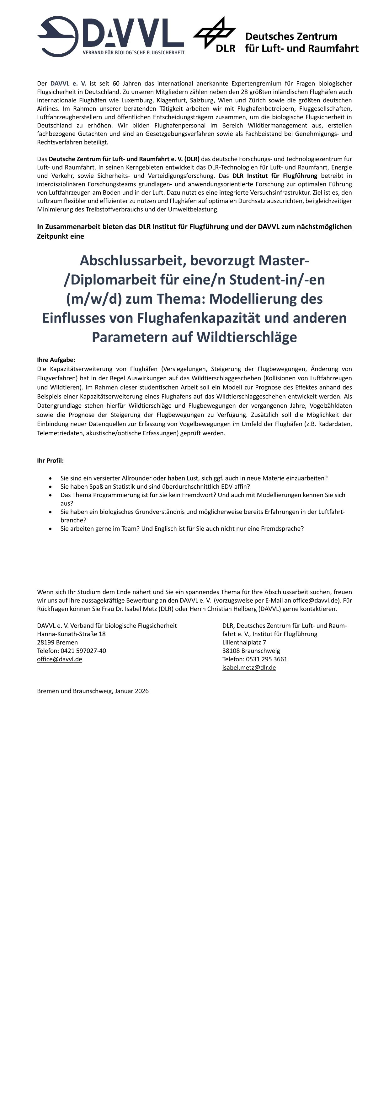 Wenn sich Ihr Studium dem Ende nähert und Sie ein spannendes Thema für Ihre Abschlussarbeit suchen, freuen wir uns auf Ihre aussagekräftige Bewerbung an den DAVVL e. V. (vorzugsweise per E-Mail an office@davvl.de). Für Rückfragen können Sie Frau Dr. Isabel Metz (DLR) oder Herrn Christian Hellberg (DAVVL) gerne kontaktieren.